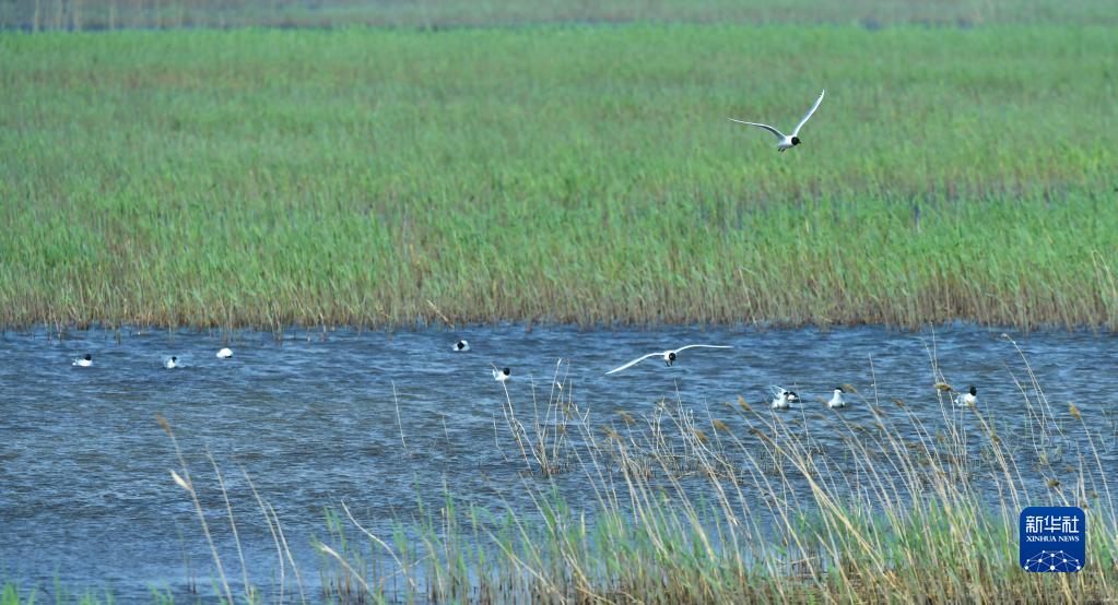 5月5日在盘锦市辽河口湿地南小河黑嘴鸥繁殖区拍摄的黑嘴鸥。新华社记者 杨青 摄