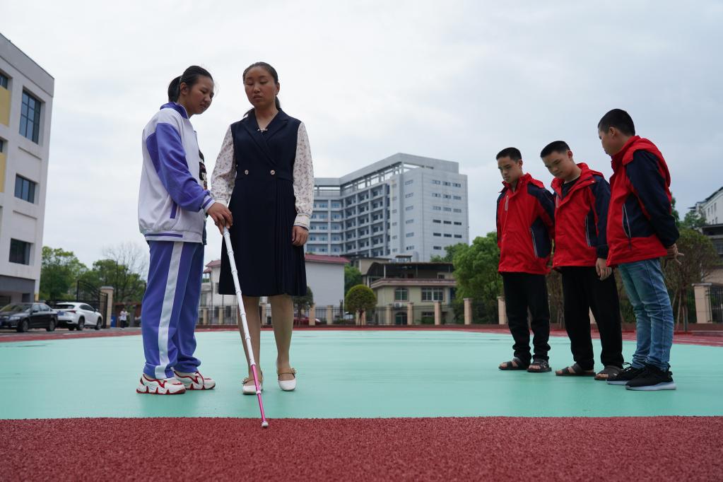 贾君婷仙教视障学生使用盲杖。新华社记者 余刚 摄