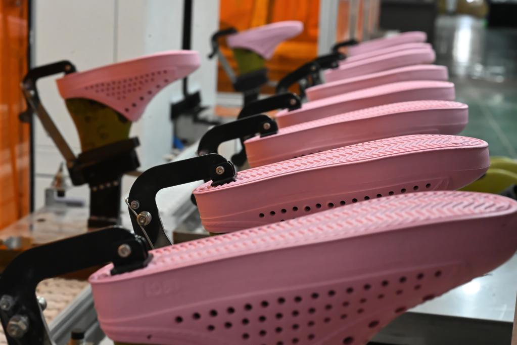 5月12日,在福建省晋江市茂泰鞋材有限公司的智能化生产车间,鞋子在流水线上传送。新华社记者 周义 摄