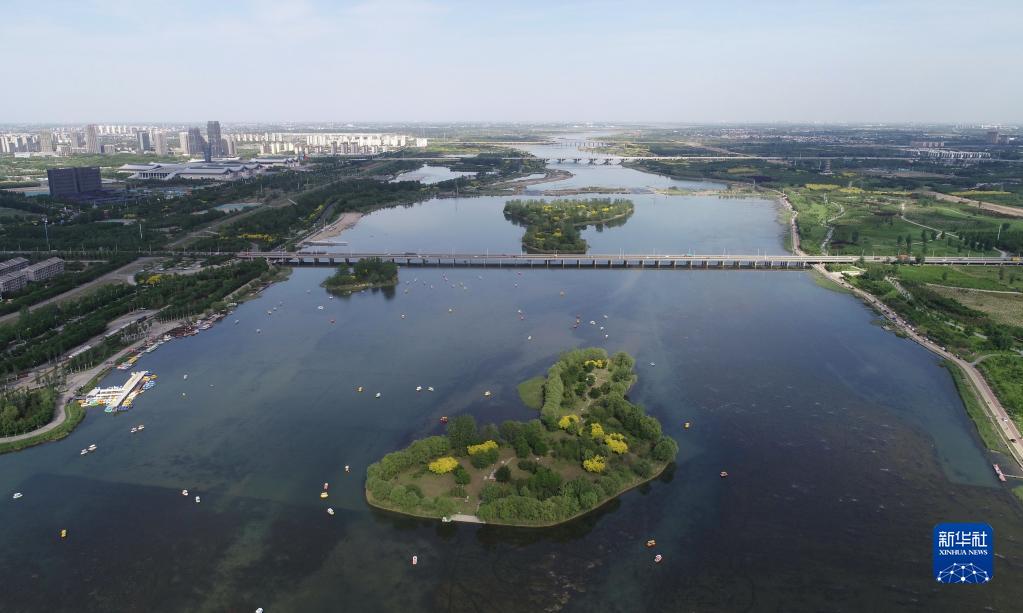 5月15日,游客在石家庄市的滹沱河景区内划船游玩(无人机照片)。