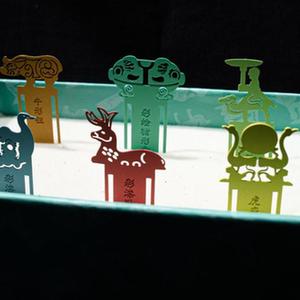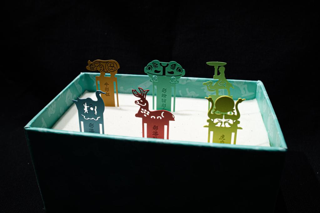 取材于彩漆木雕鸳鸯形盒、彩绘漆木卧鹿等文物制作的文创书签(5月12日摄)。新华社记者肖艺九摄