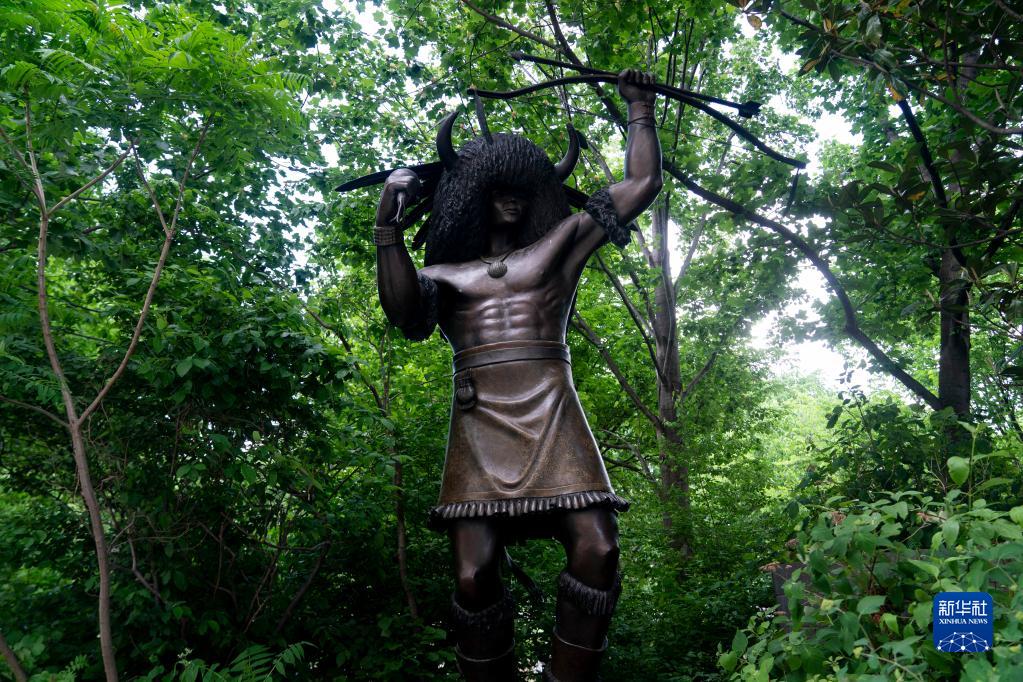 这是5月17日在美国华盛顿拍摄的美国印第安人国家博物馆外的一尊印第安人雕塑。