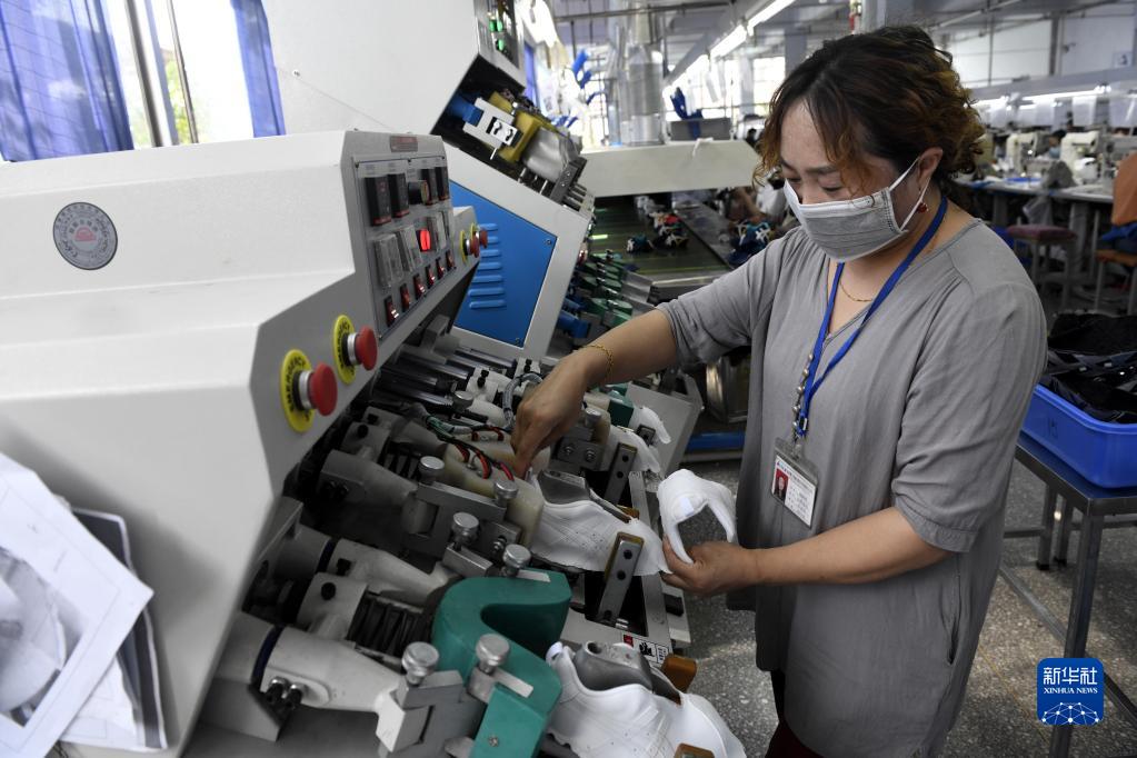 5月18日,山东省枣庄市峄城区阴平镇一家鞋业公司的工人在生产运动鞋。