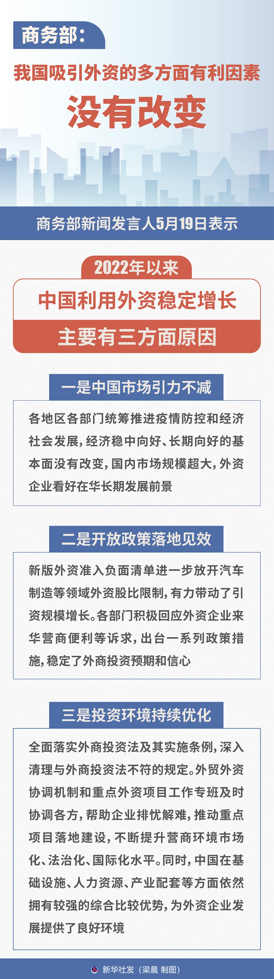新华社北京5月19日电(记者王雨萧、谢希瑶)商务部新闻发言人束珏婷19日表示,当前,受多重因素影响,我国利用外资面临诸多挑战,但吸引外资的多方面有利因素没有改变。