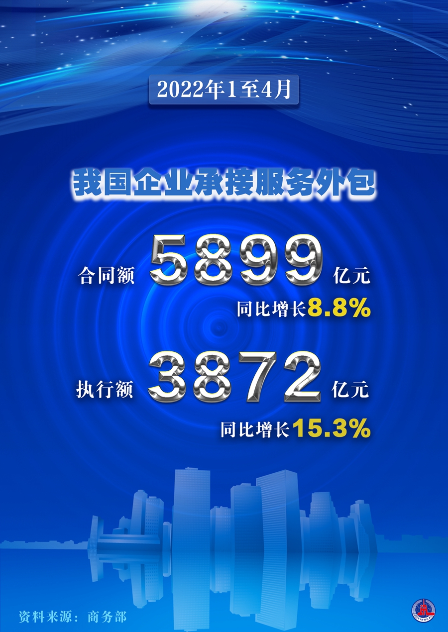 新华社北京5月19日电(记者王雨萧、谢希瑶)商务部19日发布数据显示,1至4月,我国企业承接服务外包合同额5899亿元,执行额3872亿元,同比分别增长8.8%和15.3%。