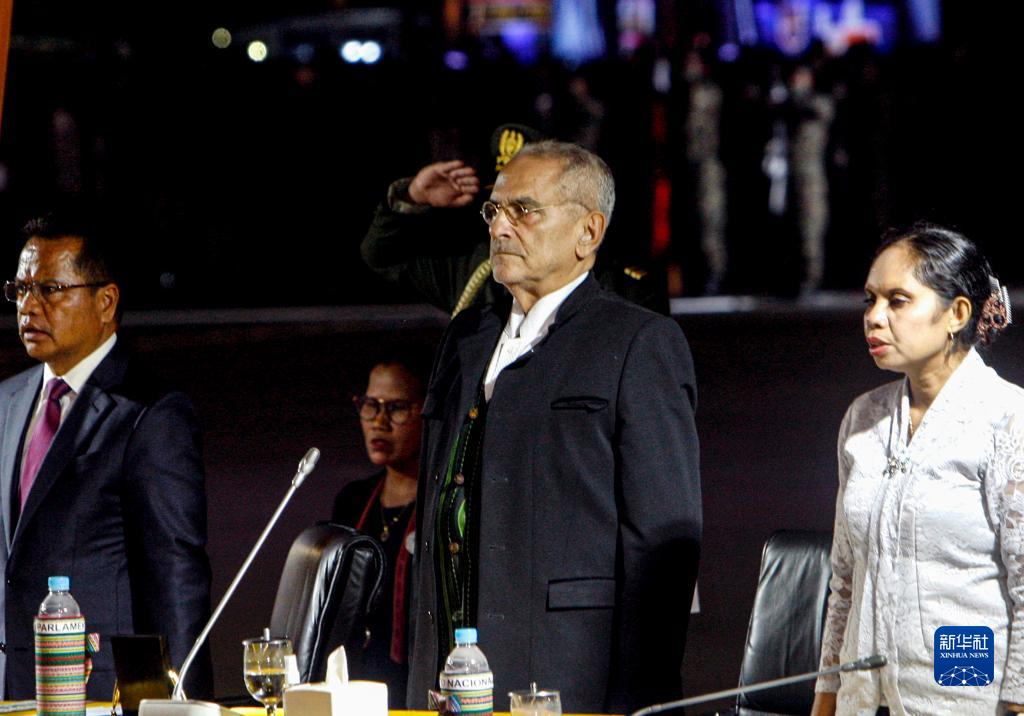 5月19日深夜,东帝汶新总统奥尔塔(中)在帝力出席就职仪式。东帝汶新总统奥尔塔20日在帝力国民议会大厦宣誓就职。新华社发(阿莫里 摄)