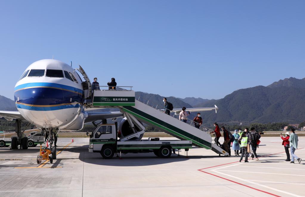2021年11月27日,广东韶关丹霞机场,乘客在登机。新华社记者 黄国保 摄