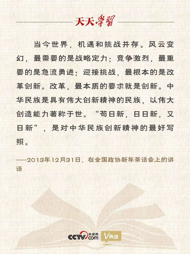 每逢重要场合,习近平总书记都要谈改革、谈创新。他曾多次引用“苟日新,日日新,又日新”这句古语,强调创新是民族进步的灵魂,是一个国家兴旺发达的不竭源泉,也是中华民族最深沉的民族禀赋。生活从不眷顾因循守旧、满足现状者,从不等待不思进取、坐享其成者,而是将更多机遇留给善于和勇于创新的人们。在党的十八届五中全会上,习近平总书记提出“创新、协调、绿色、开放、共享”新发展理念,其中“创新”居于五大发展理念之首。