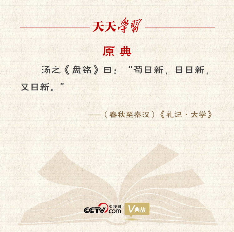 “苟日新,日日新,又日新”是商朝的开国君主成汤刻在澡盆上的警词,旨在激励自己自强不息,创新不已。文中三个“新”字,本义是指洗澡除去肌肤上的污垢,使身体焕然一新,在《礼记·大学》中引申为精神上的弃旧图新。因此,这句话的意思是:如果能每天除旧更新,就要天天除旧更新,不间断地更新又更新。