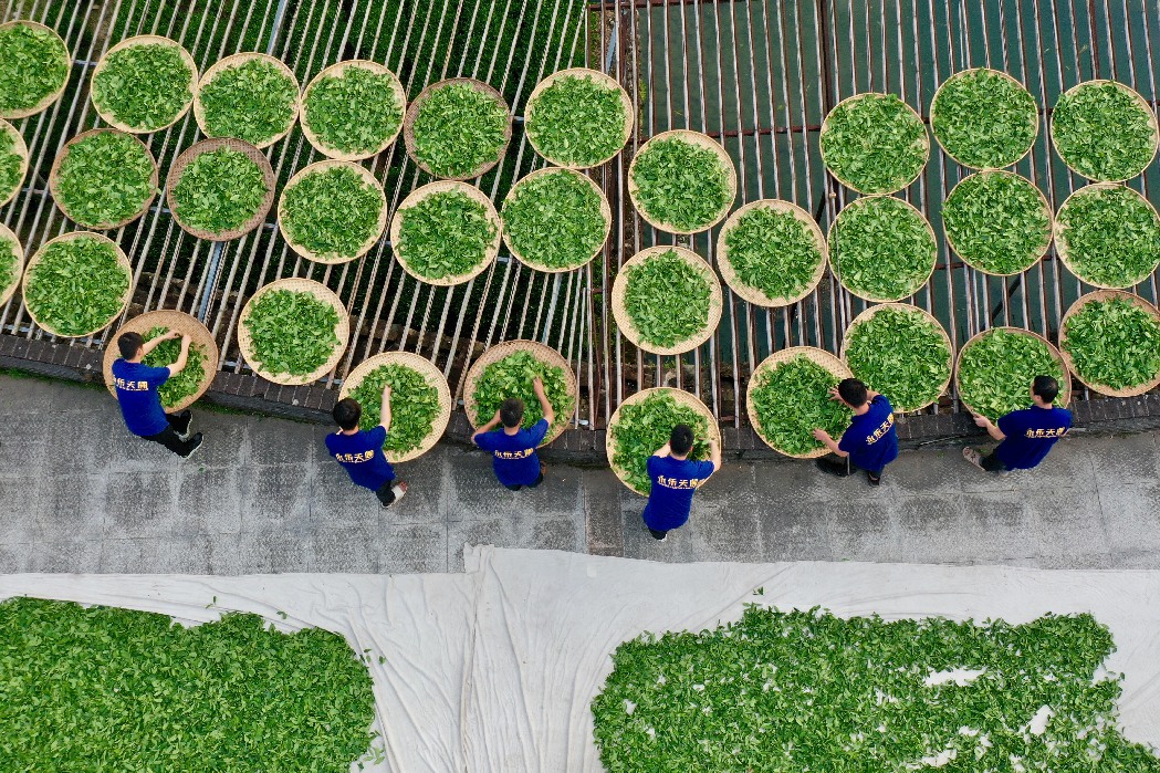 ↑5月6日,福建省武夷山市星村镇仙凡茶厂工人在制作武夷岩茶(无人机照片)。新华社记者 姜克红 摄
