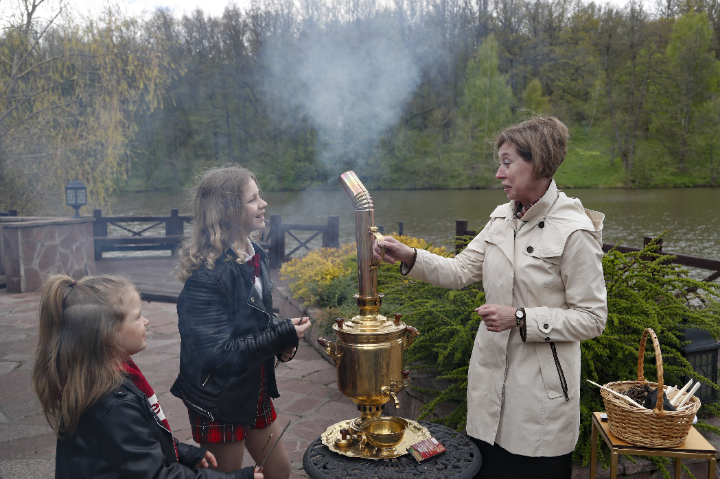 ↑5月18日,在俄罗斯图拉州的茶炊博物馆,孩子们学习如何使用传统俄式茶炊。新华社发(亚历山大摄)