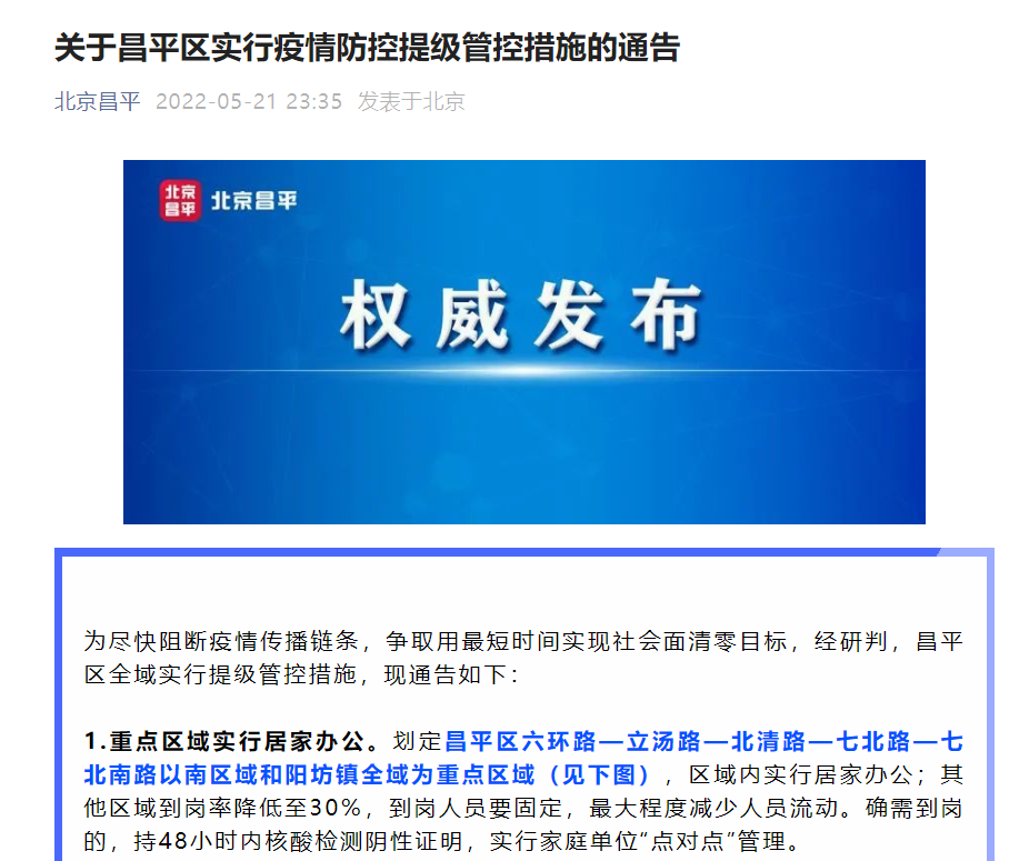 为尽快阻断疫情传播链条,争取用最短时间实现社会面清零目标,经研判,昌平区全域实行提级管控措施,现通告如下: