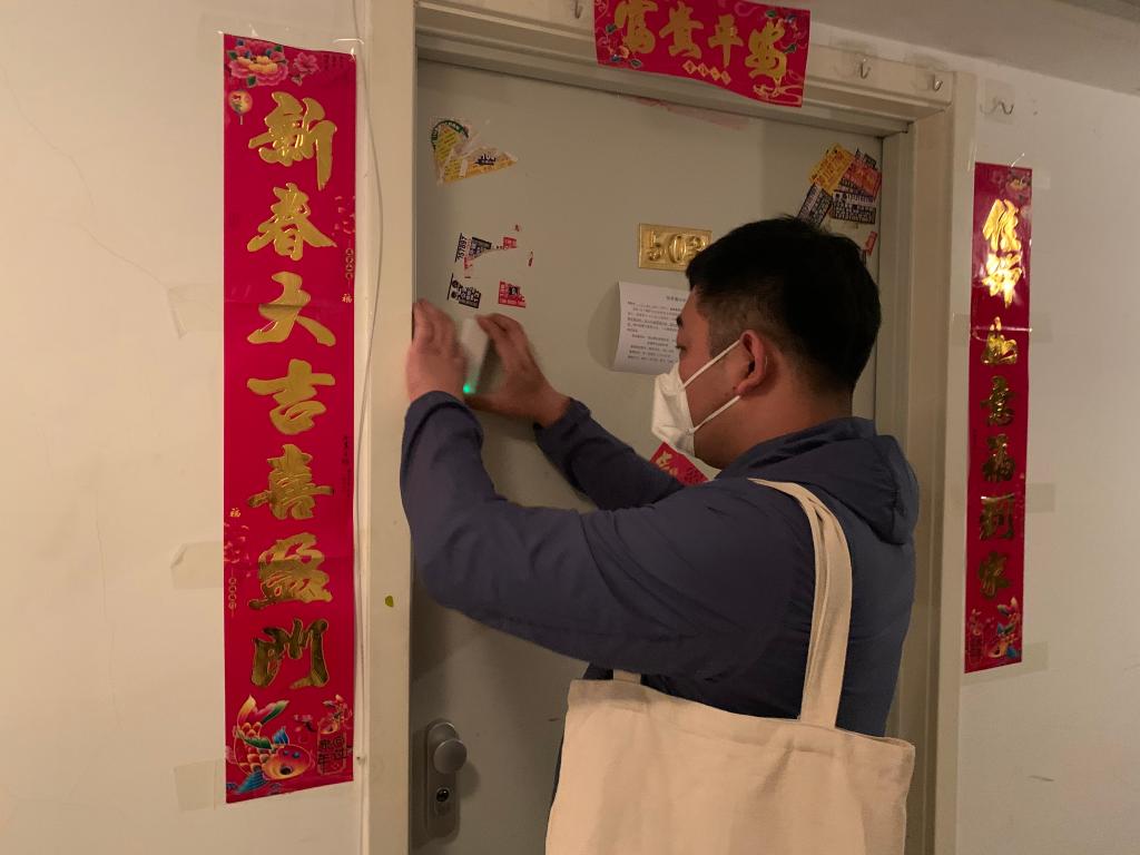 赵鹏为居家隔离居民安装门磁。(受访者供图)