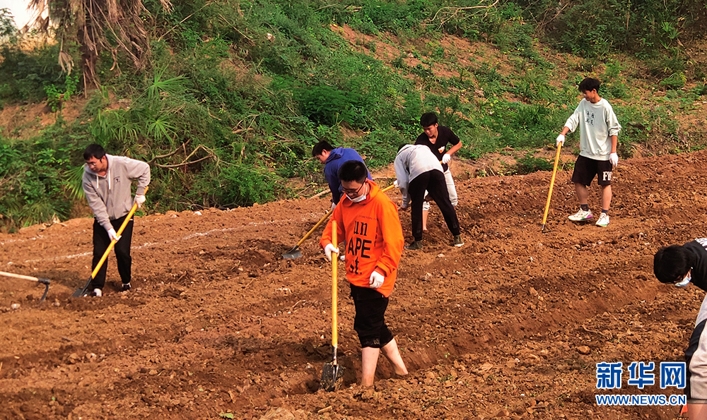 湖北大学通识教育学院的学生挖沟起垄,翻整土地,为种菜做准备。新华网发 朱恩举摄