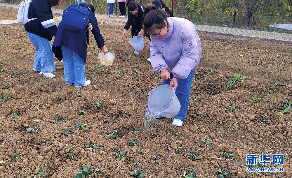 湖北大学通识教育学院的学生为菜苗浇水。新华网发 朱恩举摄