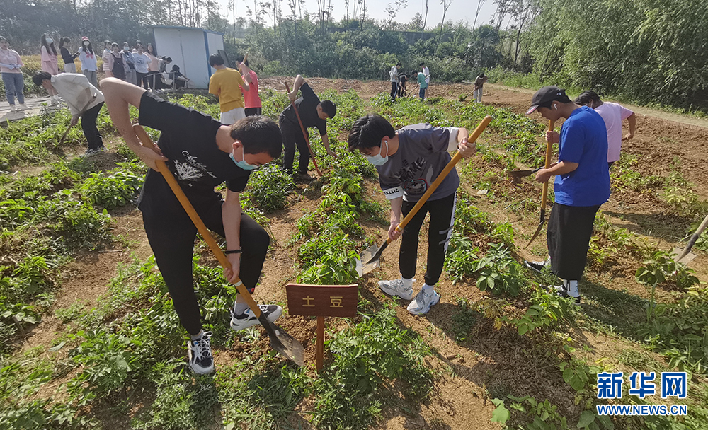 湖北大学通识教育学院的学生收获土豆。新华网发 朱恩举摄