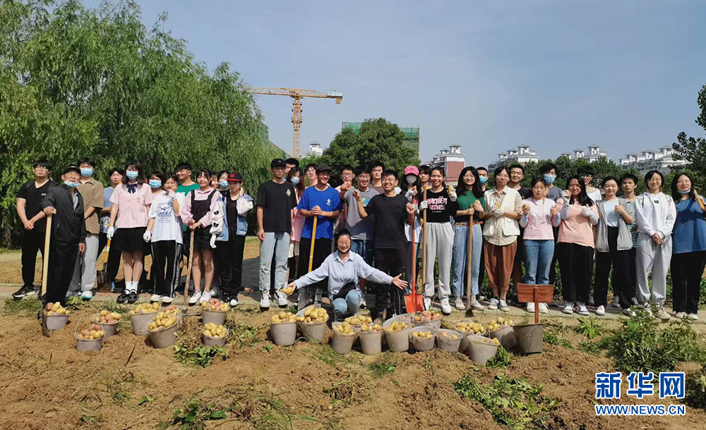 湖北大学通识教育学院的学生喜获土豆丰收。新华网发 朱恩举摄