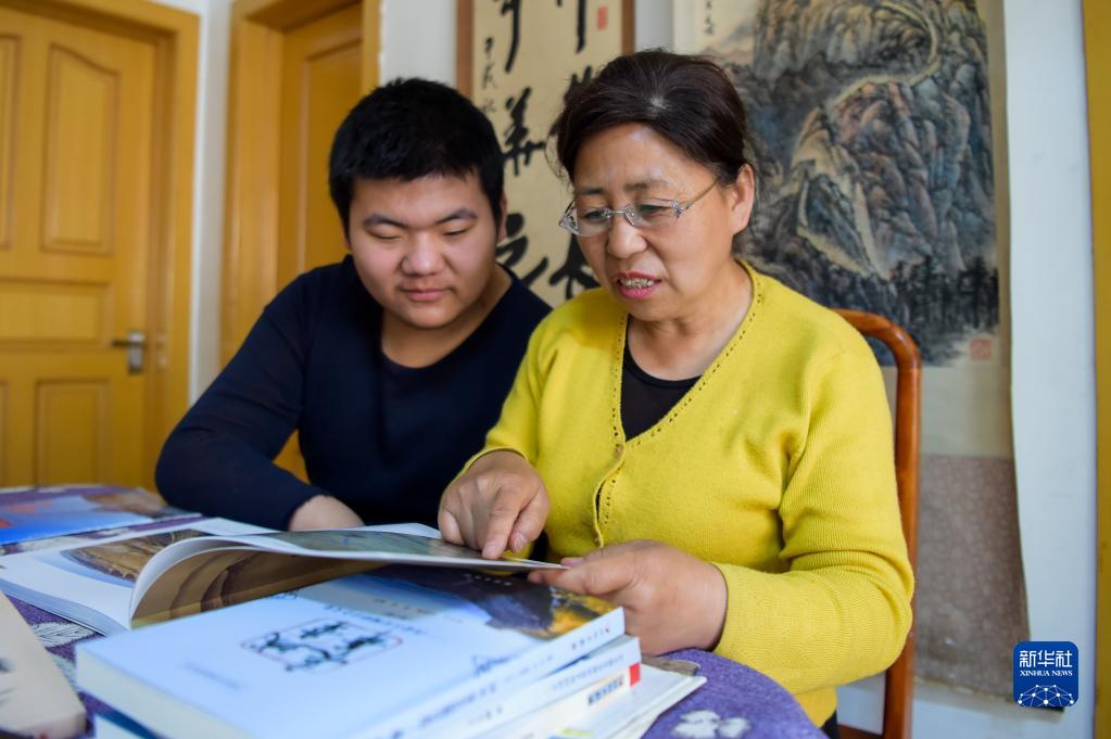 5月22日,高晓梅(右)在家中向儿子王东麟介绍关于长城的知识。
