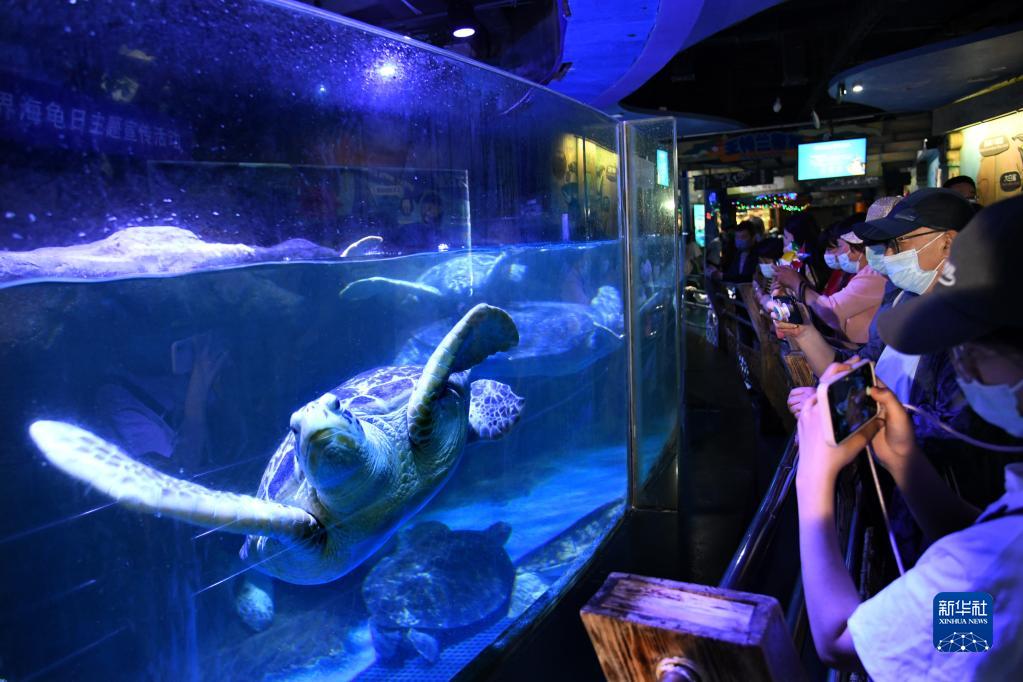 5月23日,游客在青岛海昌极地海洋公园海龟科普展上观赏海龟。