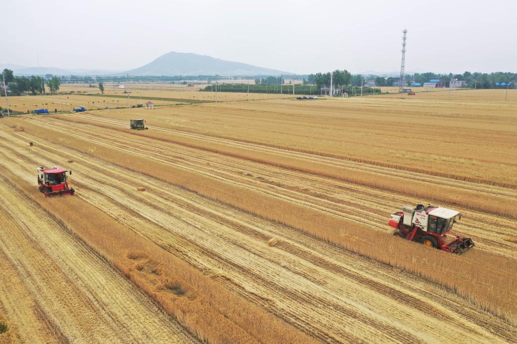 5月22日,河南省南阳市唐河县湖阳镇周安村村民在收获小麦。(新华社记者张浩然 摄)