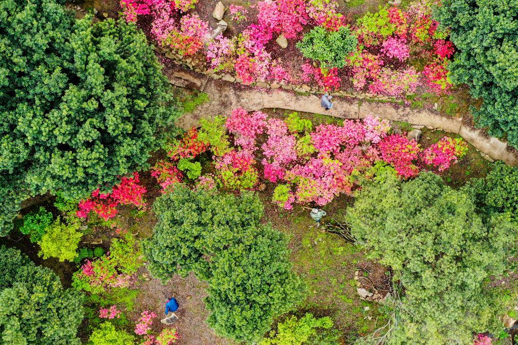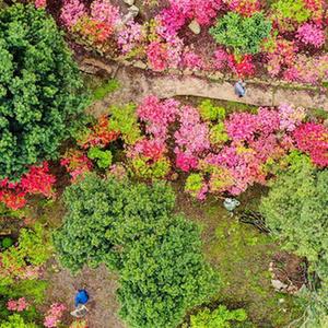 2022年4月14日,农民在浙江省湖州市长兴县煤山镇一生态果园内劳作(无人机照片)。新华社发(吴拯摄)