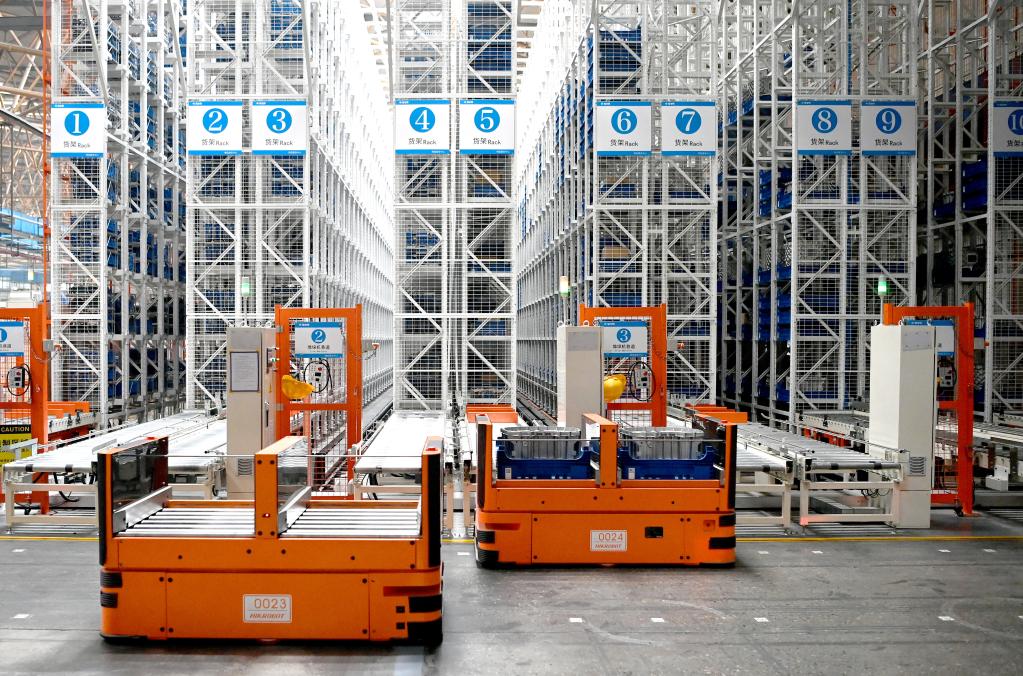 法士特集团西安高新厂区智慧物流小车在进行物品运输。新华社记者刘潇 摄