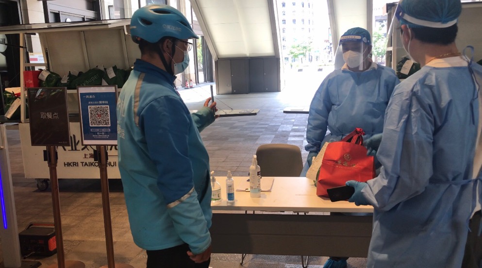 5月21日,在兴业太古汇室外,外卖小哥向工作人员出示“场所码”的扫码结果后领取货物。新华社记者 周蕊 摄
