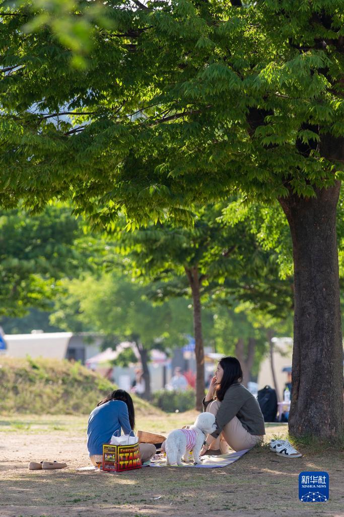 5月24日,市民在韩国首尔汝矣岛汉江公园消暑。
