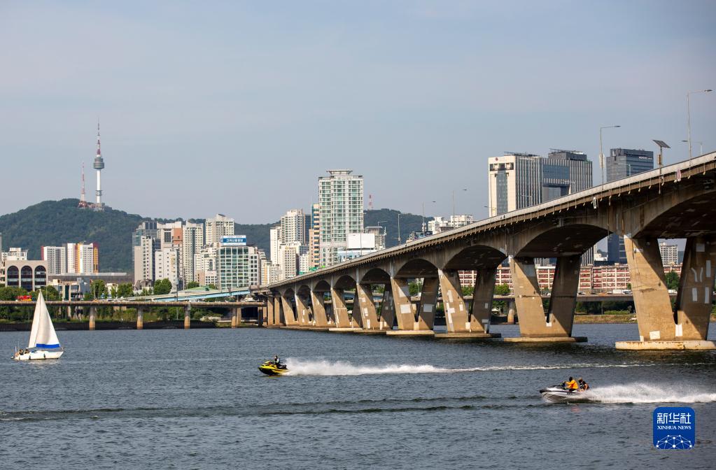 5月24日,游客在韩国首尔汝矣岛汉江公园参加水上项目消暑。