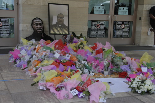 2020年6月9日,在美国得克萨斯州休斯敦,举行弗洛伊德葬礼的教堂外摆满鲜花。(新华社发,劳承跃摄)