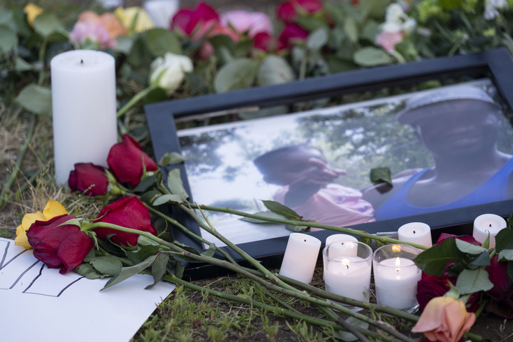 2021年5月25日,在美国华盛顿白宫附近举行的悼念弗洛伊德的集会上,人们将鲜花和蜡烛摆放在弗洛伊德和家人的照片旁。(新华社记者 刘杰 摄)