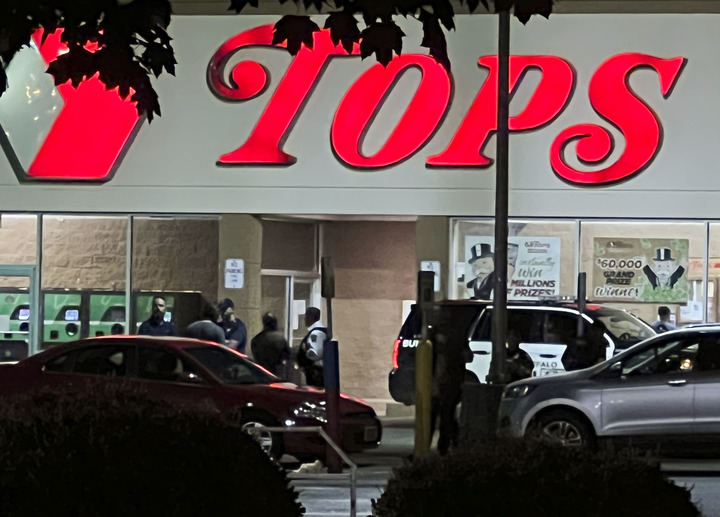 5月15日凌晨,警察在美国纽约州布法罗市的枪击案现场工作(手机拍摄)。(新华社发,张杰摄)