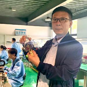 薛照辉介绍公司研发生产的电力传感器。新华社记者王皓摄