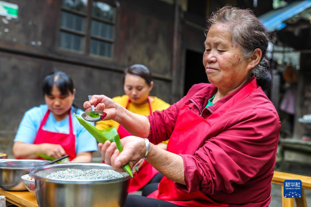 5月25日,村民在贵州省岑巩县思旸镇龙江村包粽子。