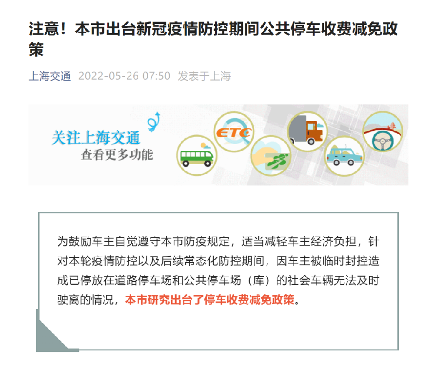 同时,上海交通部门还将对后续常态化疫情防控期间停车费实行优惠,包括收费道路停车场和国有公共停车场(库)均优惠收费,在车辆滞留期间实行按日计费。