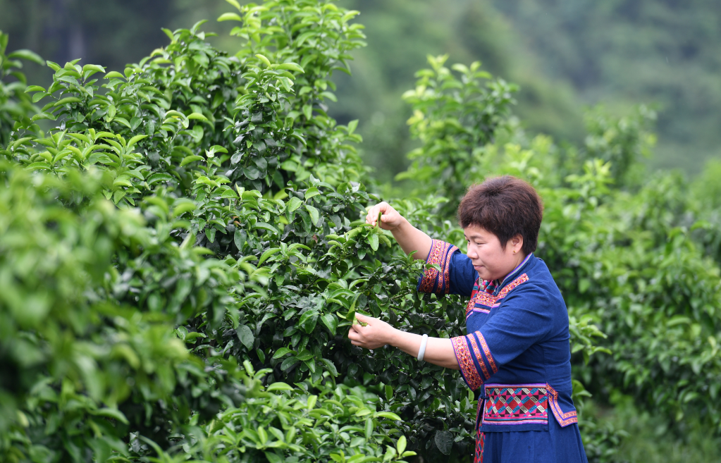 雨后的下南乡波川村,起伏的山峰被薄雾萦绕。毛南族妇女谭美春来到果园,查看柑橘定梢情况。
