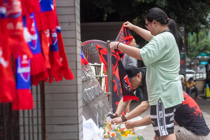 5月24日,在重庆两江竞技足球俱乐部门前,球迷用各种方式向球队告别。新华社记者 唐奕 摄
