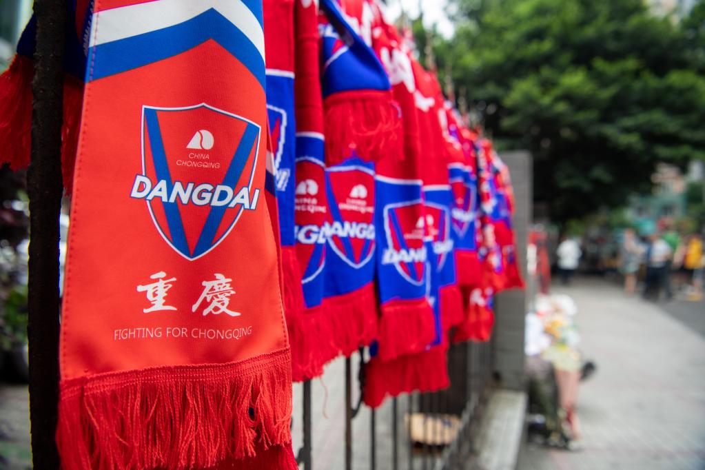5月24日,重庆两江竞技足球俱乐部门前的围栏上挂满了球迷送来的俱乐部围巾。新华社记者 唐奕 摄