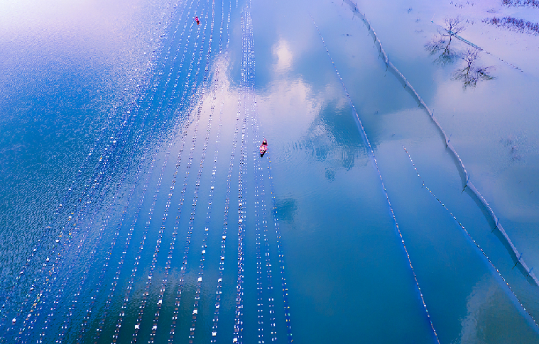 初夏时节,安徽省阜阳市颍上县大赵村的珍珠养殖基地里一派水乡好风光。波光粼粼的水面上,布满一排排河蚌养殖网箱,当地村民划着小船,忙着采收珍珠蚌。