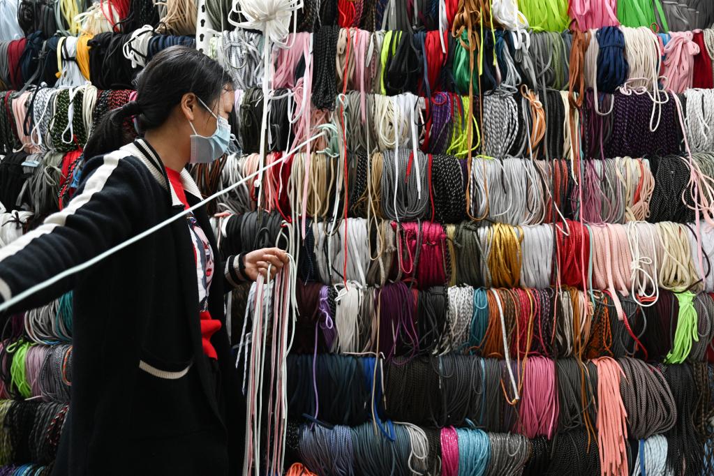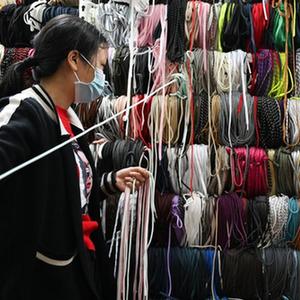 5月16日,在福建省晋江国际鞋纺城,一家鞋带织造企业的销售人员在挑选鞋带。新华社记者 周义 摄