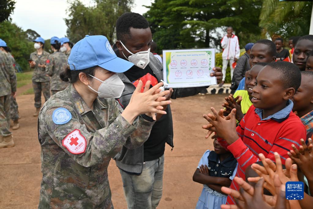 5月26日,在刚果(金)布卡武市国际SOS儿童村,中国第25批赴刚果(金)维和医疗分队队员教孩子们七步洗手法。新华社发