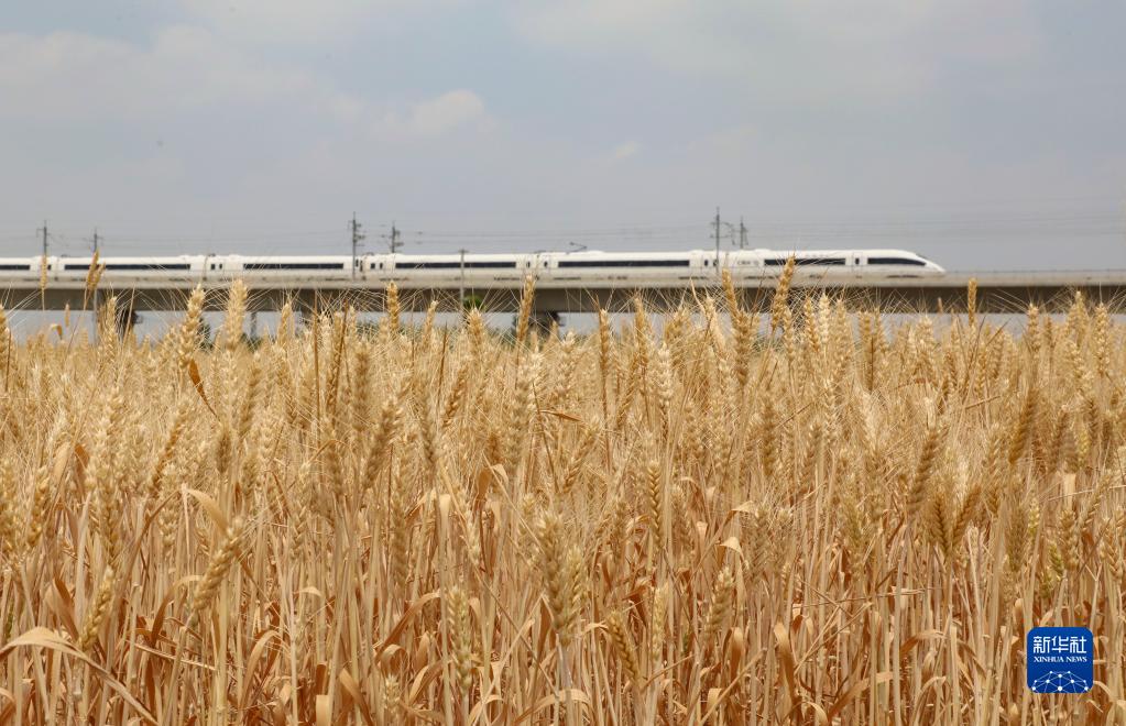 5月29日,在山东省临沂市河东区太平街道,一列动车从麦田旁驶过。
