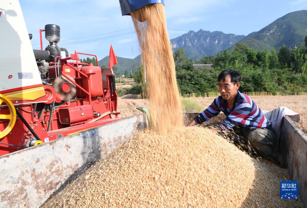 5月28日,在河南省济源市克井镇,收割机将收获的小麦装车。