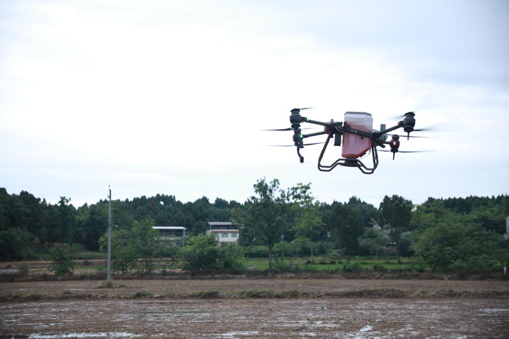 在三台县金石镇土城村,一架无人机在直播水稻。新华社记者 刘琼 摄