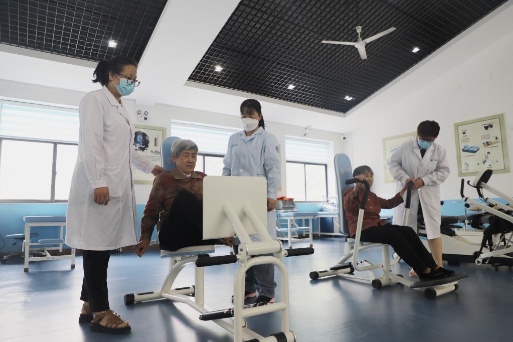 5月27日,在山东省博兴县吕艺镇老年公寓医养康复中心,医护人员指导农村老人利用专业器械进行康复锻炼。(博兴县委宣传部供图)