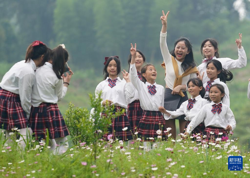 在分宜县洞村乡,老师钟灵珊(右五)带着合唱团的孩子们在户外练歌玩耍,拍照留念(5月25日摄)。
