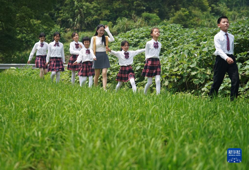 在分宜县洞村乡,老师钟灵珊(右四)带着合唱团的孩子们在田间玩耍,感受自然之美(5月25日摄)。
