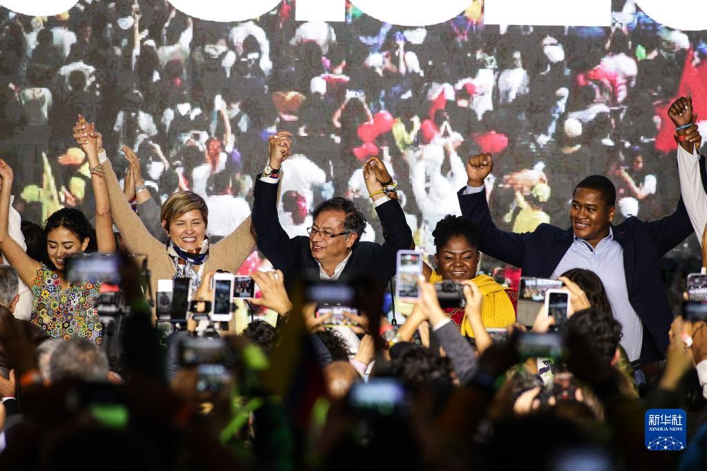 5月29日,在哥伦比亚波哥大,左翼竞选联盟“哥伦比亚历史公约联盟”候选人古斯塔沃·佩特罗(中)庆祝在总统选举首轮投票中得票领先。新华社发(帕斯摄)