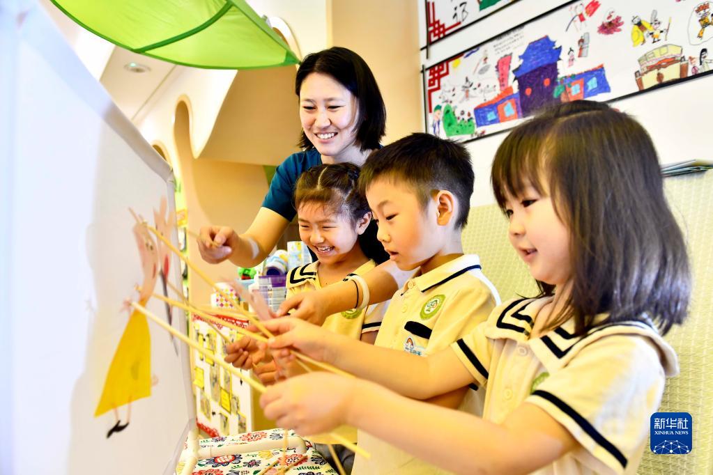 5月30日,在山东省实验幼儿园,老师带着孩子们体验皮影戏。新华社记者 郭绪雷 摄