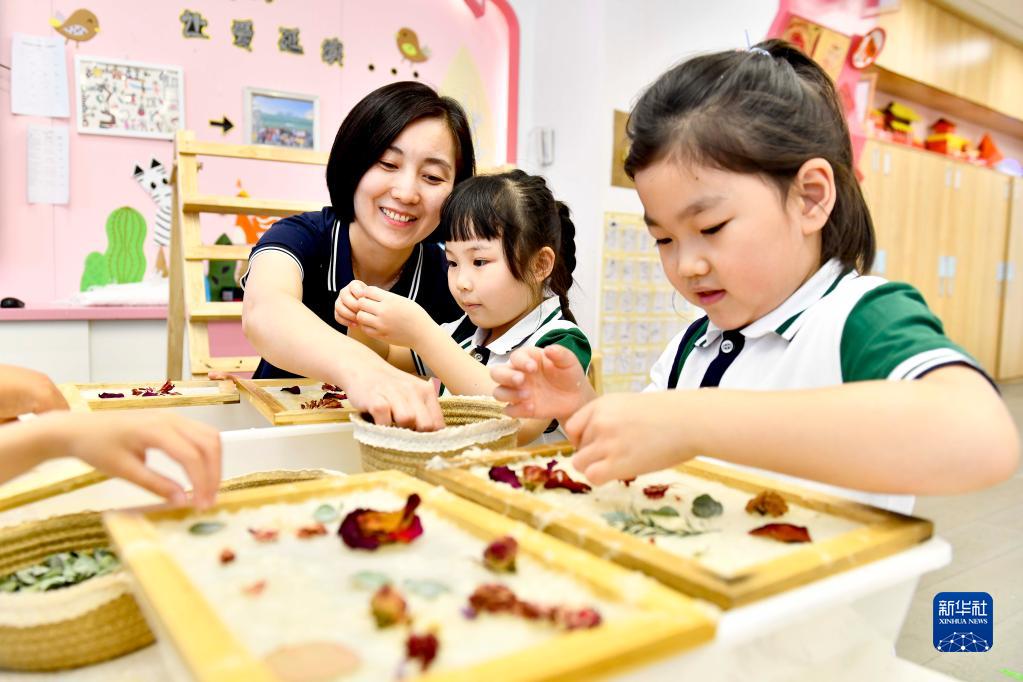 5月30日,在山东省实验幼儿园,老师带着孩子们体验花草纸制作。新华社记者 郭绪雷 摄